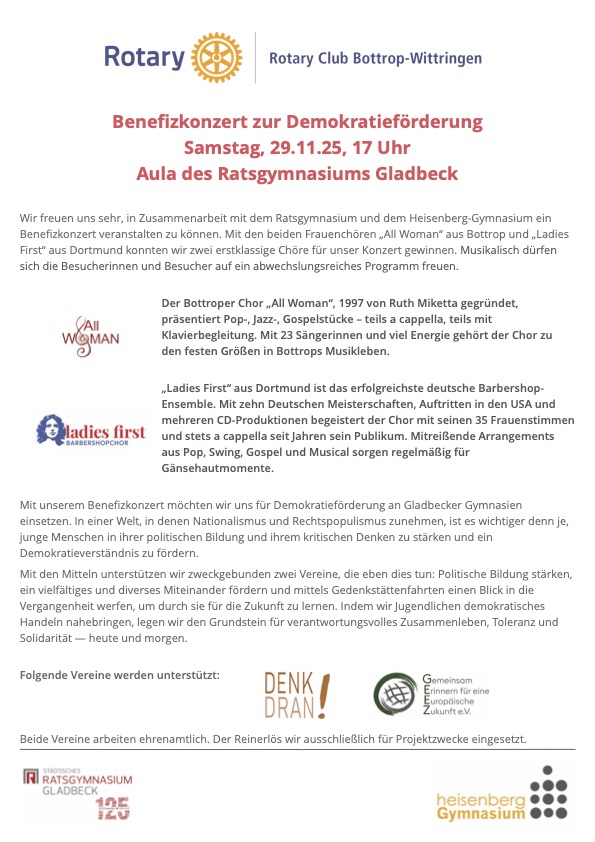 Am Samstag, den 29. November 2025, veranstaltet der Rotary Club Bottrop-Wittringen zusammen mit dem Ratsgymnasium und dem Heisenberg-Gymnasium ein Benefizkonzert. Es wird ein abwechslungsreiches musikalisches Programm geboten, dass von den Frauenchören „All Woman“ und „Ladies First“ gestaltet wird.